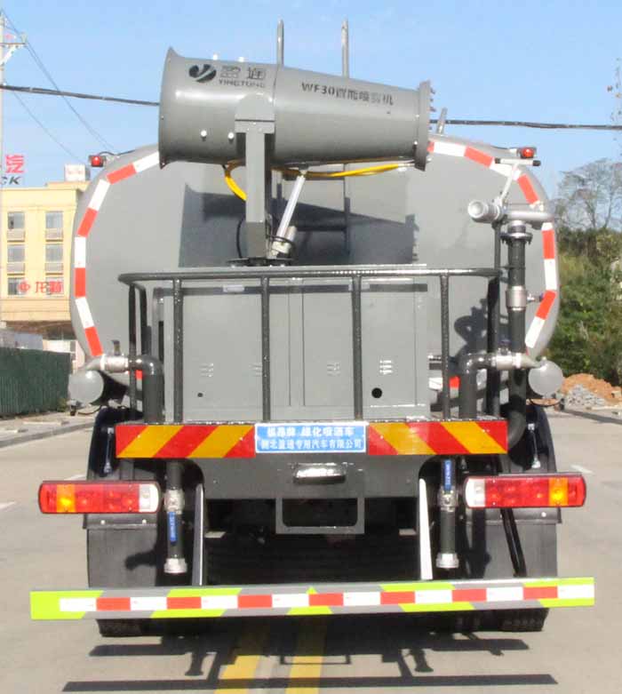 該車主要用于城鄉園林綠化噴灑作業;主要裝置為水罐及噴灑裝置;運輸介質:丙酮水溶液,介質密度:950千克/立方米.罐體總容量:16.59立方米;罐體有效容積:15.8立方米;罐體外形尺寸(長×長軸×短軸)(mm):6800×2400×1450.側、后防護材料均為:Q235碳鋼,連接方式均為:螺栓連接,后部防護截面尺寸(mm):120×50,后部防護離地高度(mm):490;ABS系統型號/生產企業:CM4XL-4S/4M,廣州瑞立科密汽車電子股份有限公司.該車隨底盤安裝限速裝置,限速89km/h.選裝前部不帶電子水炮,該狀態下車長為10150mm;當前部安裝電子水炮時,車長為10650mm,車輛前伸500mm.選裝前部電子水炮裝置樣式,選裝車輛前部鴨嘴裝置. |