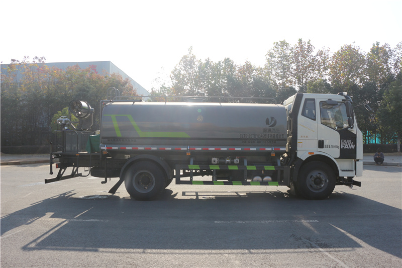 解放15方霧炮車_解放J6L抑塵車_J6L霧炮車_湖北盈通專用汽車有限公司,選裝噴霧裝置樣式。該車用途為抑塵降霾,主要裝置為罐體及噴霧裝置;罐體有效容積:12.5立方米,罐體外形尺寸(×長軸×短軸)(mm):4800×2400×1530;ABS系統生產廠家:長春瑞立科密汽車電子有限公司,型號:CM4XL;側、后防護材料均為:Q235碳鋼,連接方式均為:螺栓連接,后部防護截面尺寸(mm):120×50,后部防護離地高度(mm):480。隨底盤選裝駕駛室。