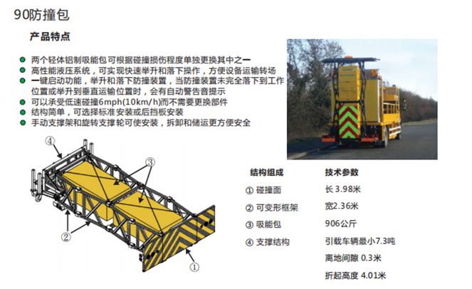 本車適用于城市道路,郊區道路,高速公路,機場橋涵等場合。主要功用:置于道路施工作業人員和設備后方,在發生追尾事故中充當肇事車輛和施工作業人員或設備的緩沖區域,并且通過自身結構變形吸收撞擊能量,最大限度的降低施工人員或設備發生危險的幾率,同時最大限度的降低肇事車輛及人員的危險。